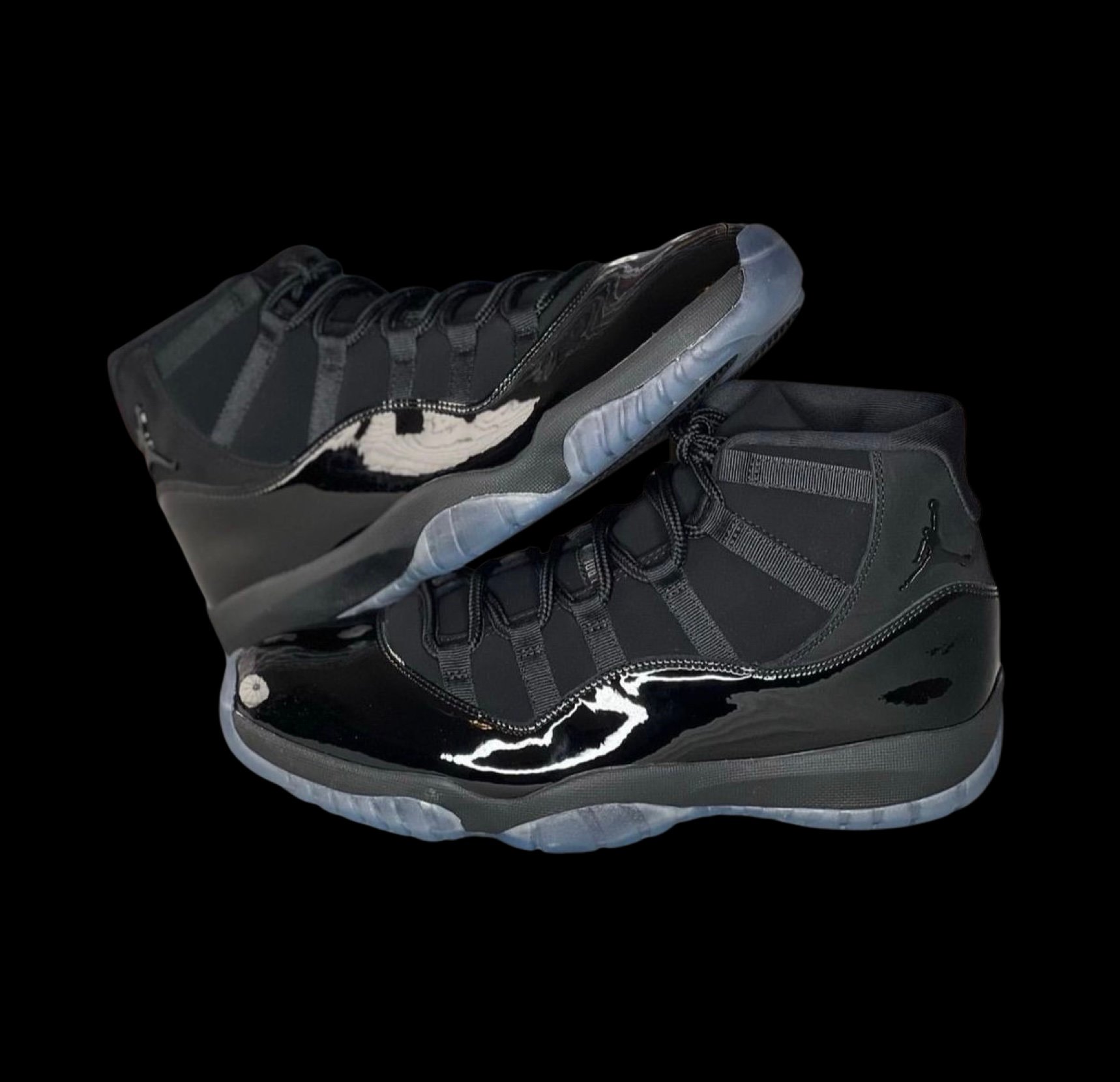 The Air Jordan 11 Retro "Cap and Gown" is an all-black colorway of the iconic Air Jordan 11, designed to resemble a graduation "Cap and Gown". It features a premium nubuck upper with a high-cut patent leather mudguard and a translucent, icy blue-tinted outsole. The design includes rope laces inspired by graduation cords, a black metal Jumpman logo, and a black 23 on the heel.