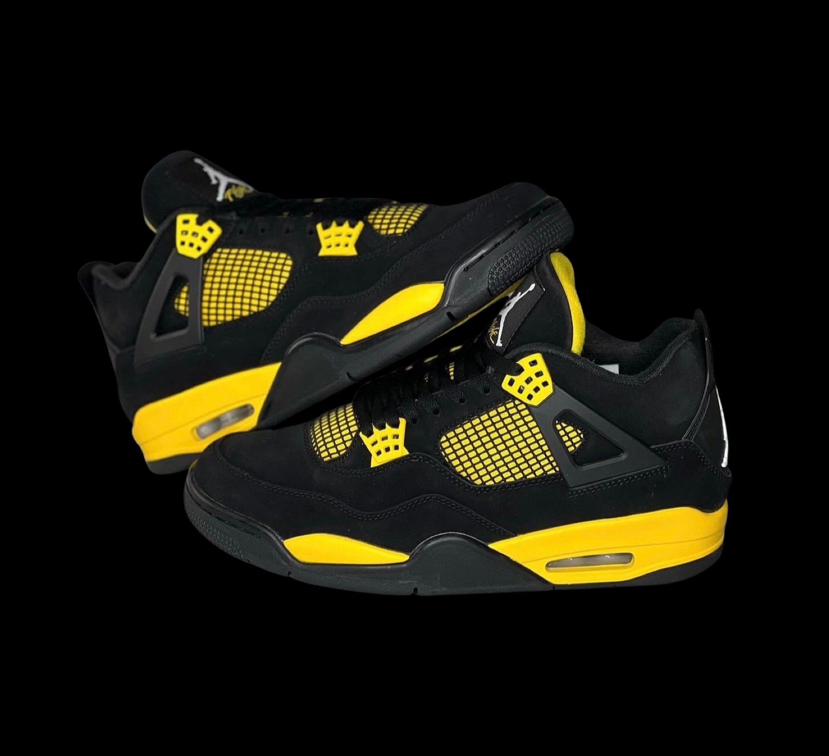 The Jordan 4 'Thunder' features an all-black nubuck upper with prominent Tour Yellow accents on the midsole, molded eyelets, tongue, and netting on the quarter panels. This 2023 re-release is a retro of the original 2006 "Thunder" colorway, bringing back the shoe's iconic design with an exposed Air-sole unit in the heel for cushioning and a rubber outsole for durability and grip.