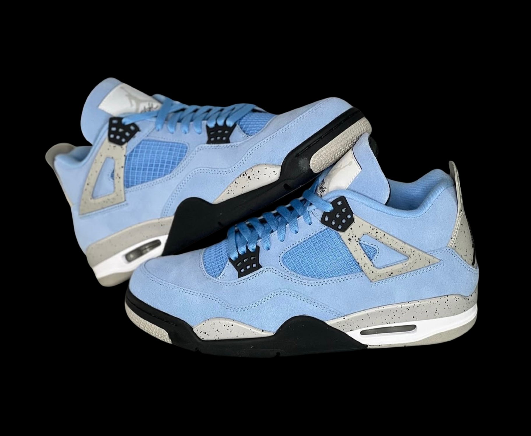 The men's Jordan 4 'University Blue' is a lifestyle basketball shoe featuring a full University Blue suede upper, complemented by synthetic mesh panels for breathability. It incorporates classic "cement" detailing with speckled grey on the wings and heel tabs, and a black and white color scheme on the midsole and outsole. Other details include a black Jumpman logo on the heel and tongue, and a tongue tag designed to resemble a jock tag on a basketball jersey.